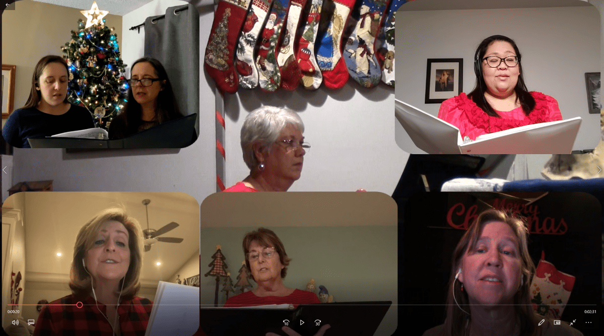 As I worked away, cutting away a few slow areas of the accompaniment, raising the volume of some vocal parts while lowering others, arranging the video tiles, little by little the project came together. My little group of women began to sound like angels, instead of a bunch of imperfect humans. I may have even heard some heavenly voices added into the mix. When the finished project was ready to present I realized something profound; while none of us sounded great and polished alone, it really came together when the voices were blended and adjusted to one another. This was true even though we were not able to sing in the same room together. I have long been acquainted with the power of singing together in a musical group, but this experience made me realize that power and support can come from a group with a common goal, even from a distance.